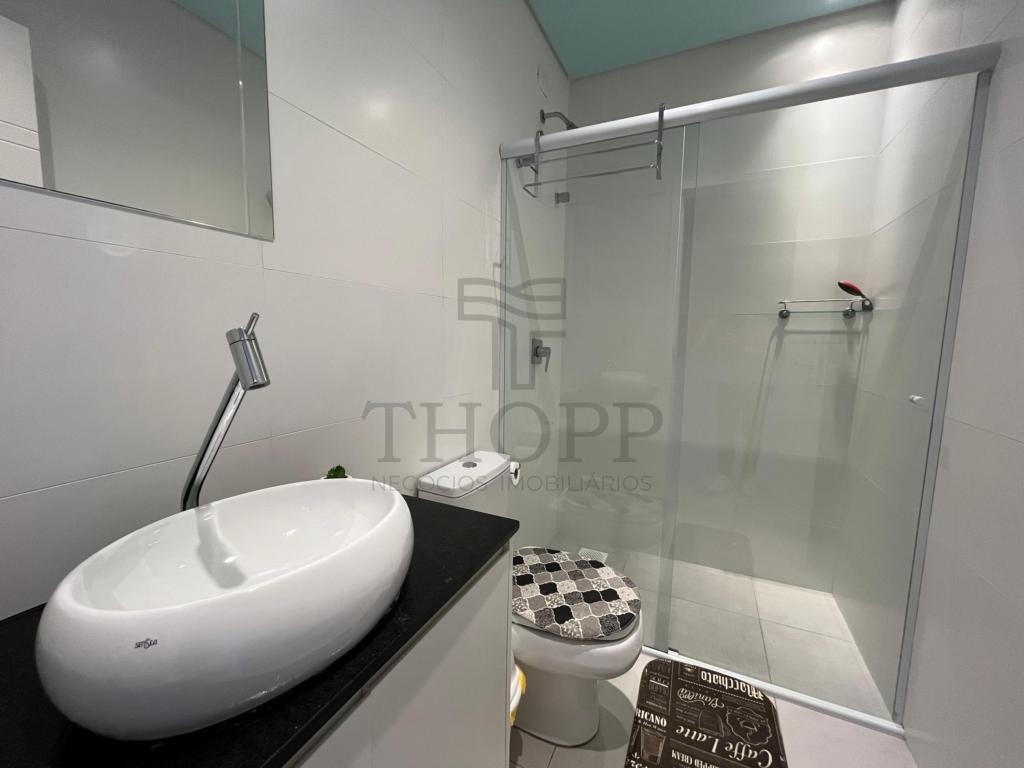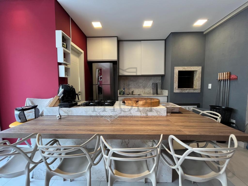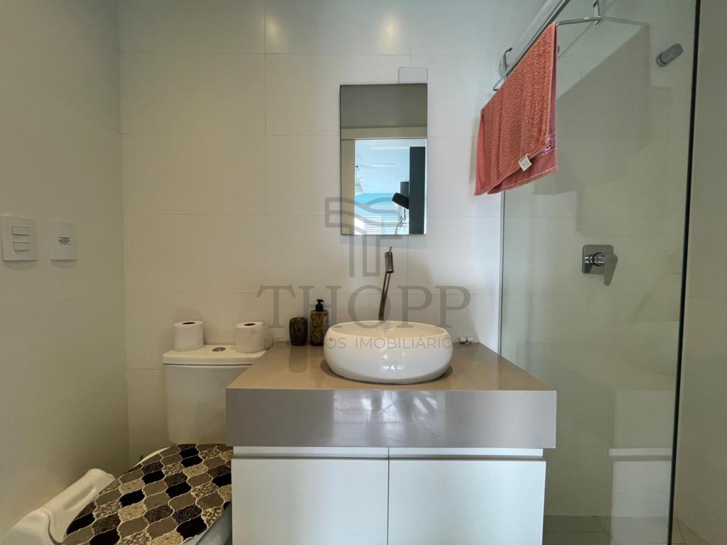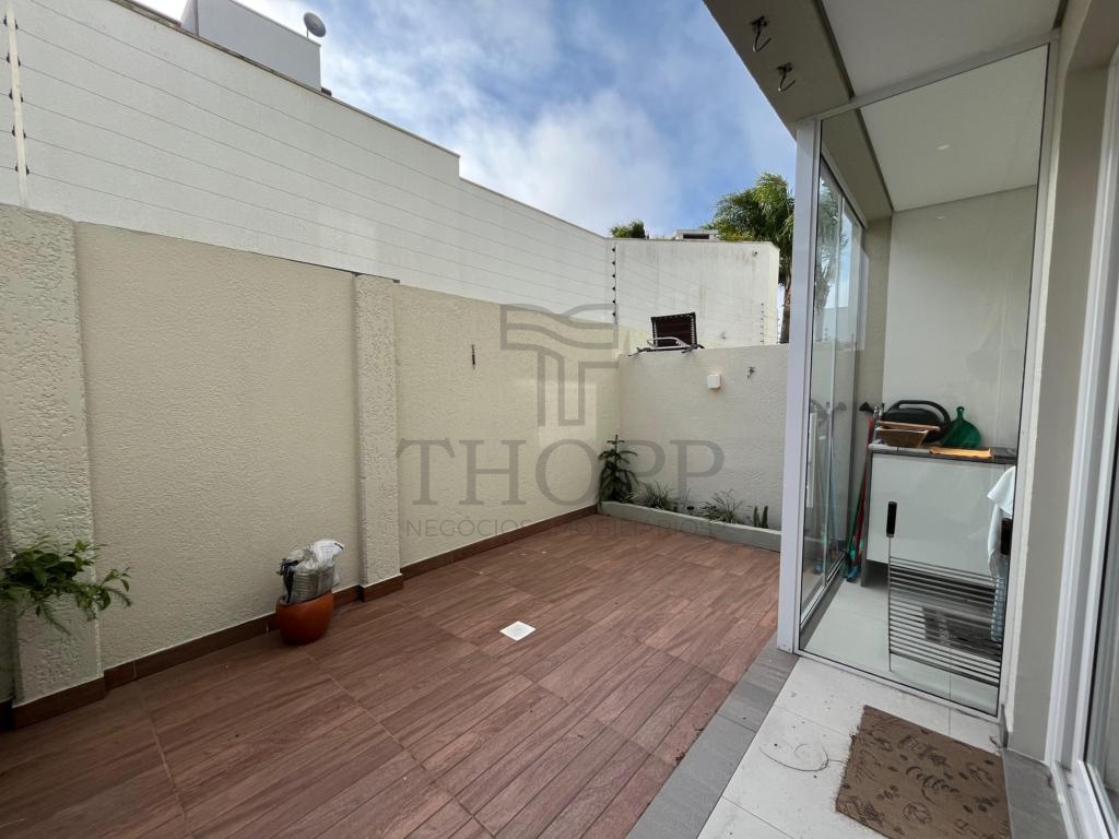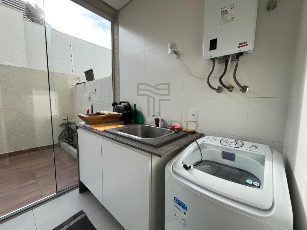 No térreo, a casa oferece uma sala espaçosa com TV, cozinha americana equipada com todos os utensílios necessários, lavabo, lavanderia e uma varanda com pátio privativo — um espaço ótimo para relaxar ou reunir a família.